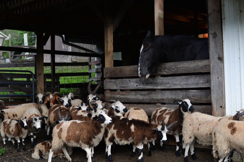 The farm currently includes approximately two dozen sheep; two goats; a horse; a handful of chickens; a flock of Christmas geese; several quail; a few turkeys; two pigs; and honey bees.